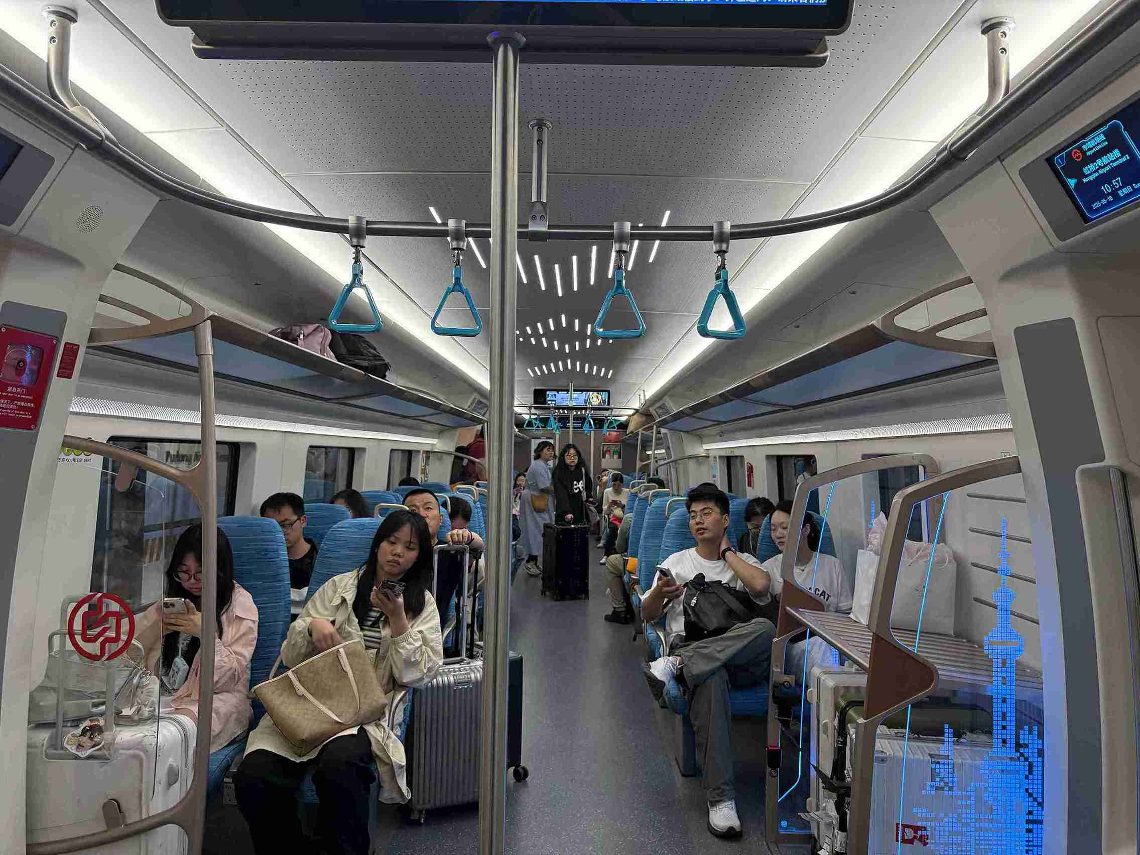 全新的機場快線,總共有七個站點,「浦東1號2號航站樓站」作為東端點,依序經過「上海國際旅遊度假區站」、「景洪路站」、「三林南站」、「康橋東站」、「中春路站」、「虹橋2號航站樓站」。這條市域線相當於穿越上海的心臟地帶,列車最高時速可達160公里,全程僅需40分鐘。相比之下,以往搭乘地鐵需要1.5小時左右,搭網約車或出租車則要花費100-200元,還可能遇到塞車。市域線的通車的確便捷又省時許多,尤其對需要轉機的旅客來說,是首選。