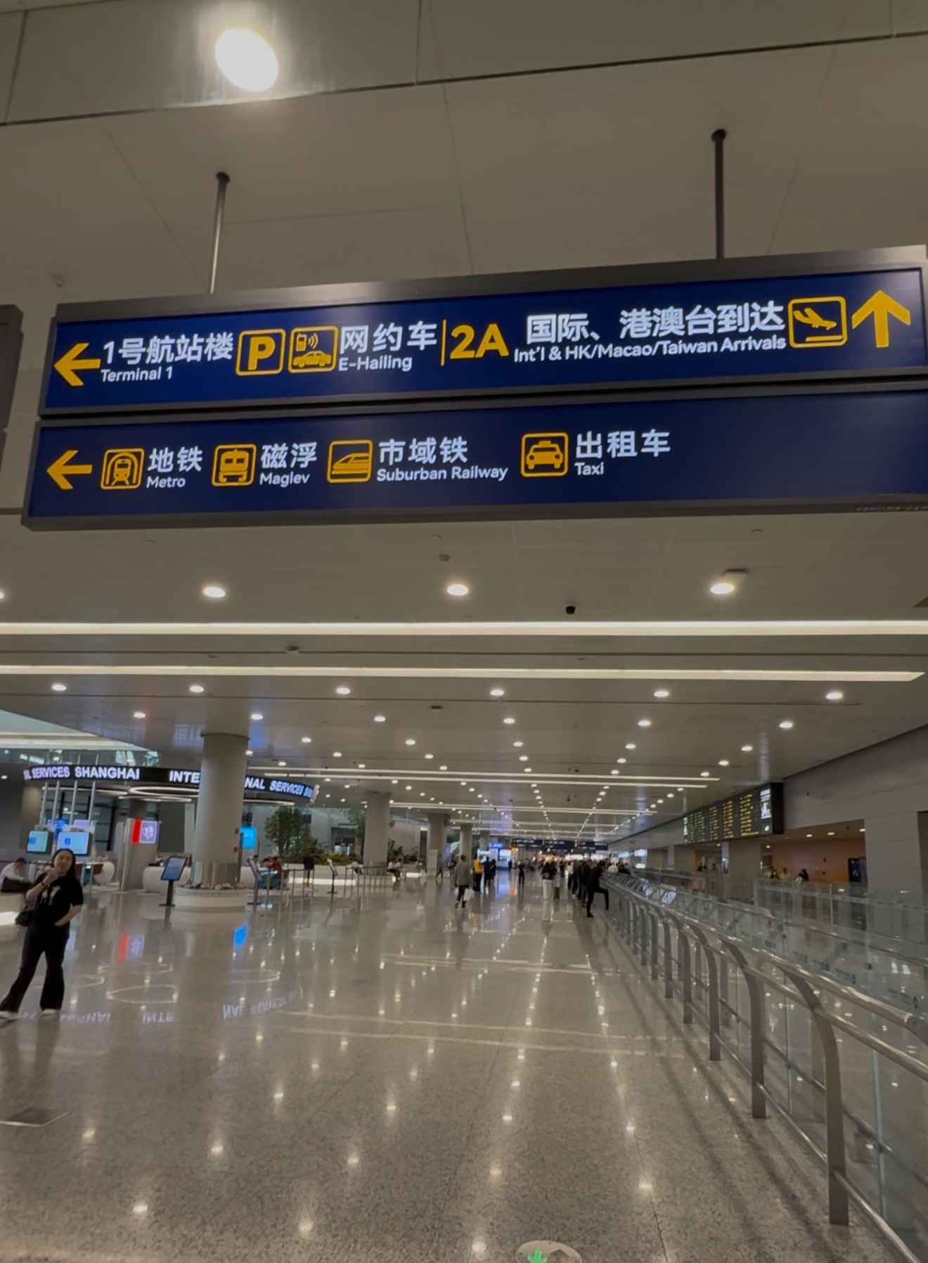 如果你抵達的是浦東機場 T1 航站樓,一樣是按照指示牌乘坐電梯前往二樓。到達二樓後,沿著指示方向往前走大概5分鐘就能看到 6 號口。從 6 號口坐電梯下去,就到達了市域線的乘車區域。