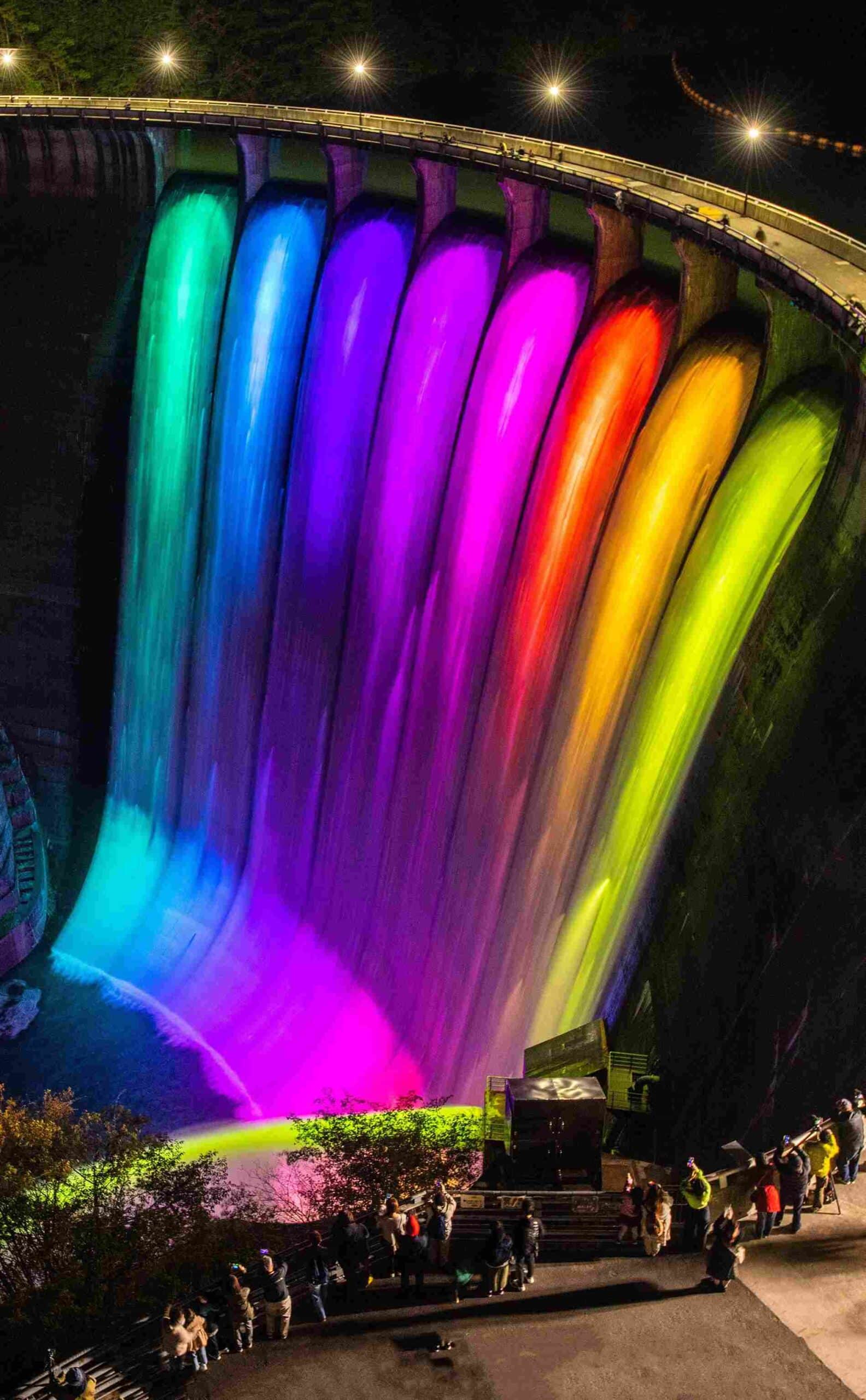 入夜後,鳴子水壩又換成另一種樣子。活動期間會舉行「彩虹簾幕放流點燈」,LED燈打在落下的水流上,整面水簾隨著燈光染上不同色彩,看起來像一座會發光的瀑布,也讓這裡成為東北頗具特色的夜景景點。白天看的是壯闊,晚上則多了幾分夢幻感,兩種氛圍差異很大。