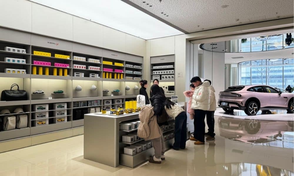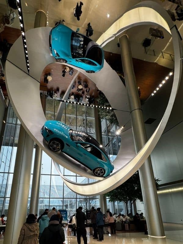 小米汽車工廠迎客大廳上,著名的莫比烏斯環及小米電動車©小旅讀
