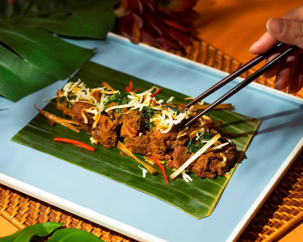 以十餘種香料慢火燉煮,軟嫩入味並加入炒椰絲增添層次,醬汁濃郁馥郁。
