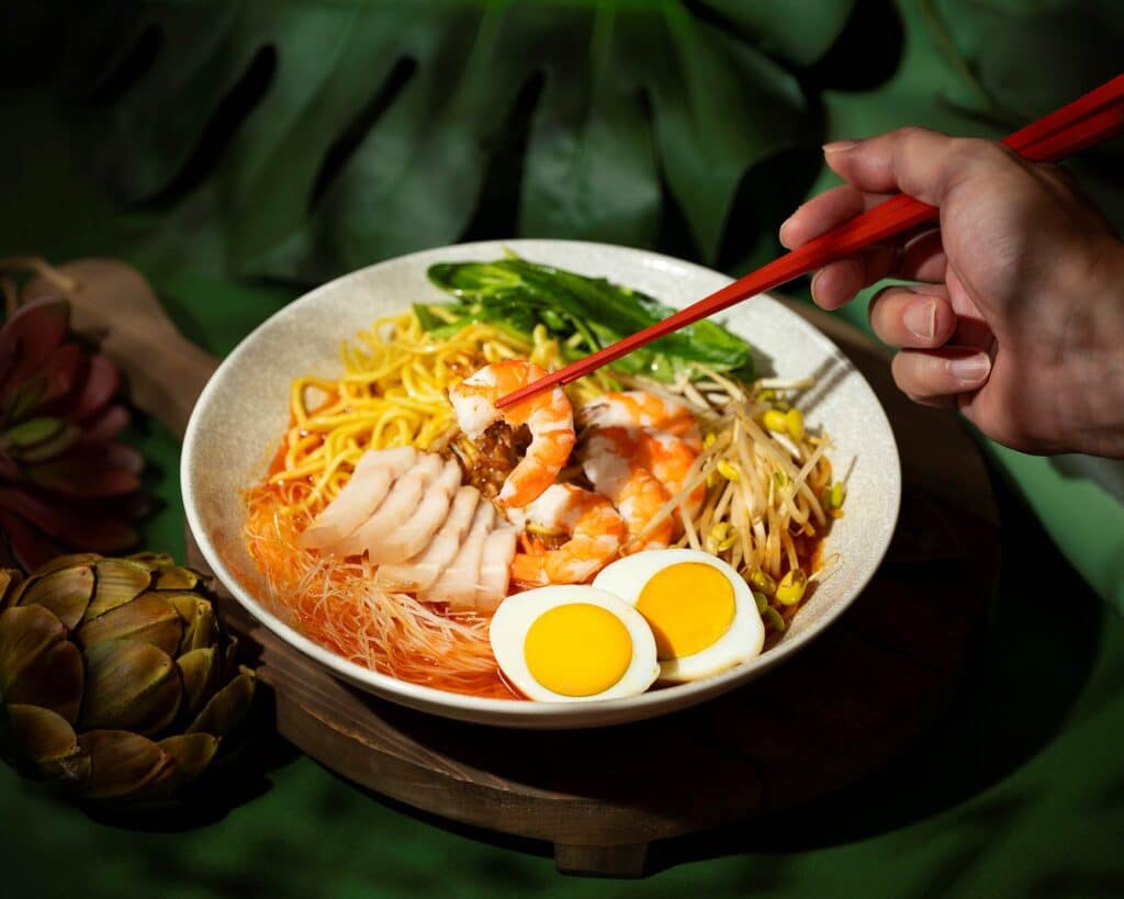 「檳城蝦麵」靈魂全在那一碗橘紅色的鮮濃蝦湯,拌入特調辣醬後,足以一秒喚醒檳城的味覺記憶。圖/台北遠東香格里拉提供