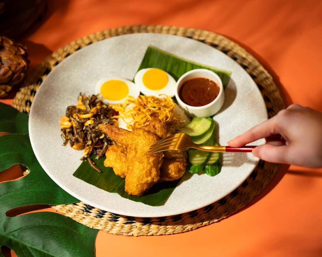 以椰奶與斑蘭葉燜煮茉莉香米,搭配參巴醬、江魚仔、烤花生及水煮蛋,成就經典國民美味。