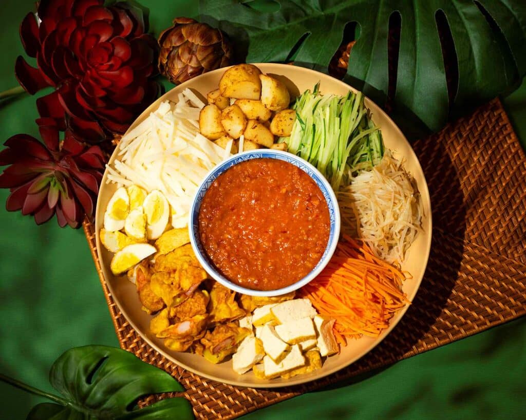 檳城道地小吃」是檳城獨有的印度沙拉,用獨門醬汁將炸豆腐、蝦餅等豐富食材拌出繽紛風味。圖/台北遠東香格里拉提供