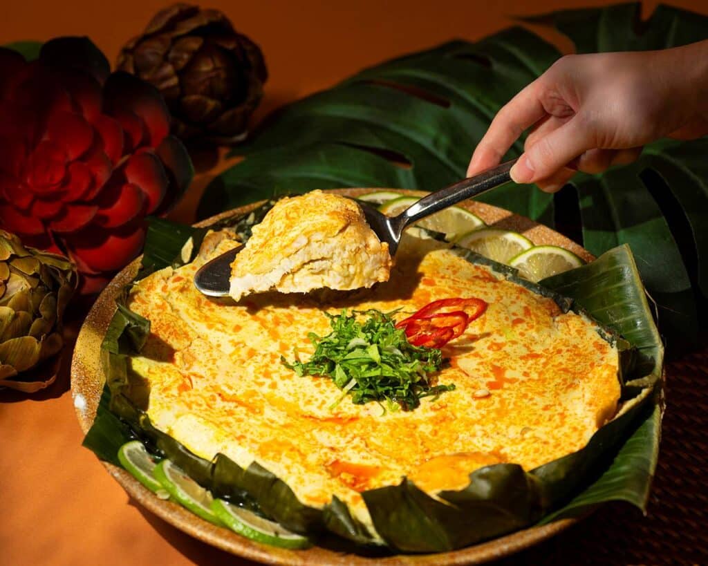 以香料與椰奶調製醬汁,覆上香蕉葉清蒸,展現南洋傳奇小吃的新詮釋。