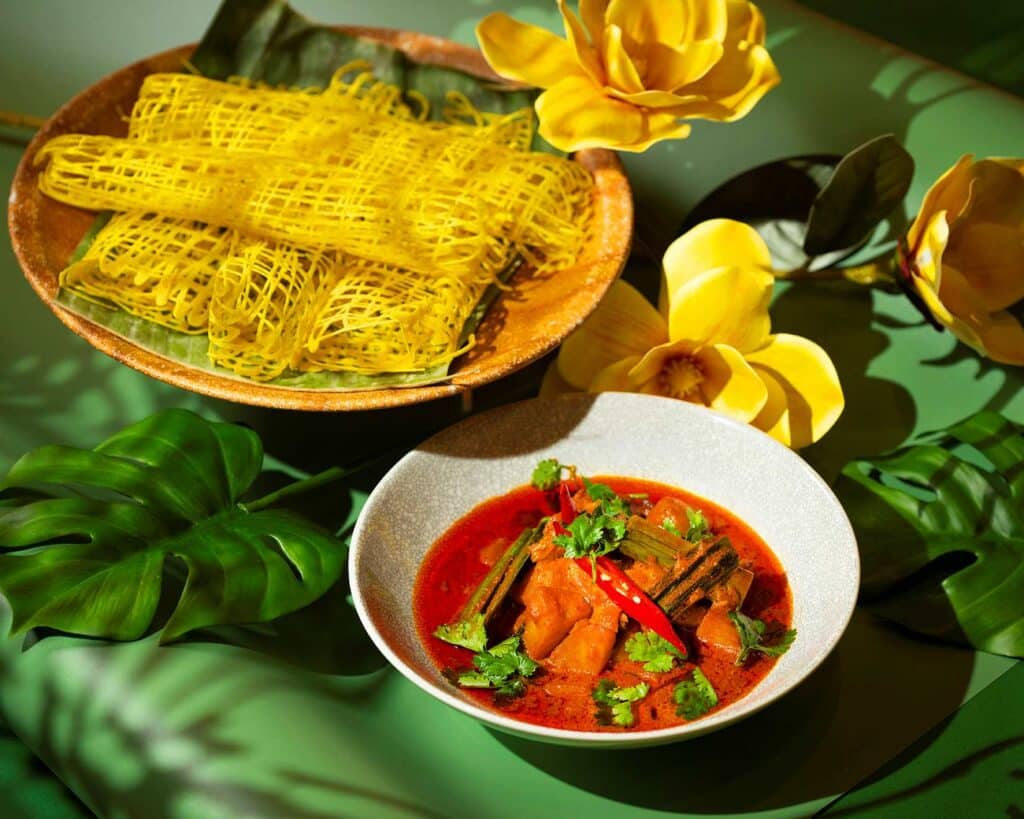 以精巧的蕾絲狀餅皮(Roti Jala)搭配香濃咖哩雞,口感細膩而濃郁。