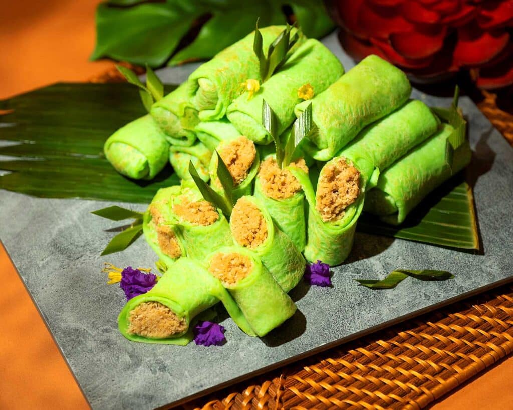 香蘭葉汁製成薄餅皮,內餡則是椰糖與椰絲完美融合,甜香不膩。
