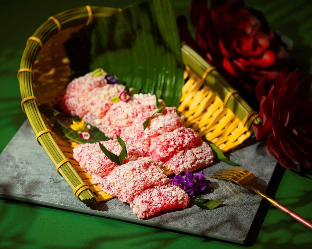 一口嚐盡玫瑰芬芳與椰絲濃醇的「玫瑰西米露糕」,口感軟糯、鹹甜交織的娘惹風味。圖/台北遠東香格里拉提供