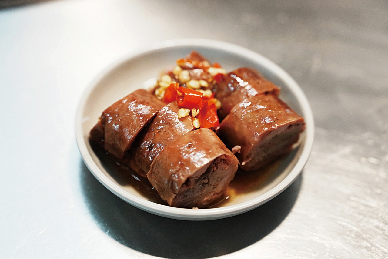 豬肝腸 似香腸,但更為粉感軟嫩 外型如烤香腸,皮薄陷軟、味濃郁,有豬肝與豬肉塊的交雜口感 適合單吃,一定要配上攤販特製的辣椒醬 孝三路、仁愛市場