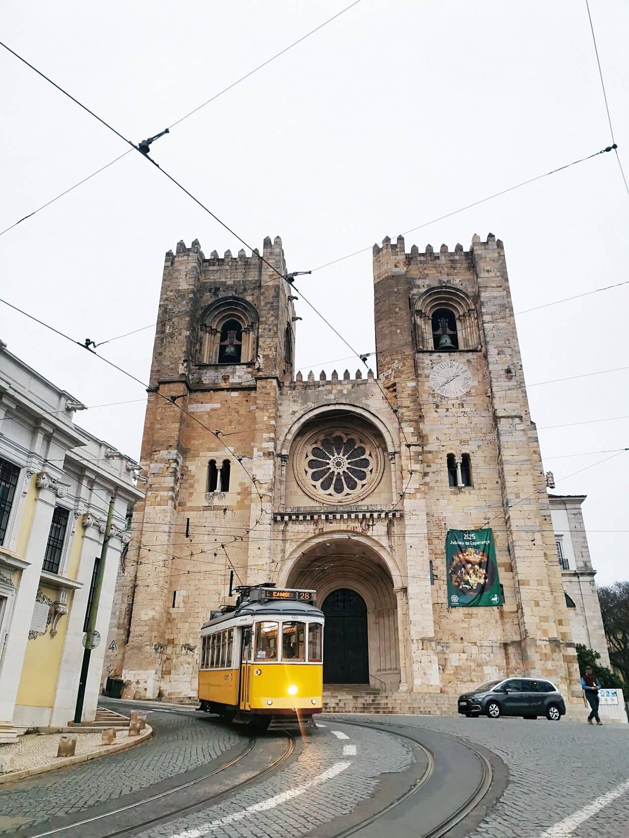 蜿蜒的街道上,黃色28號電車的木製車廂,沿路輕輕晃過窗外斜坡與紅瓦,下坡後與某棟建築擦身而過的一個轉角,一座莊嚴又古老的建築躍然眼前。里斯本主教座堂(Sé de Lisboa),城市歷史最悠久的教堂,近900年的風霜靜靜刻在每一塊石牆上。
