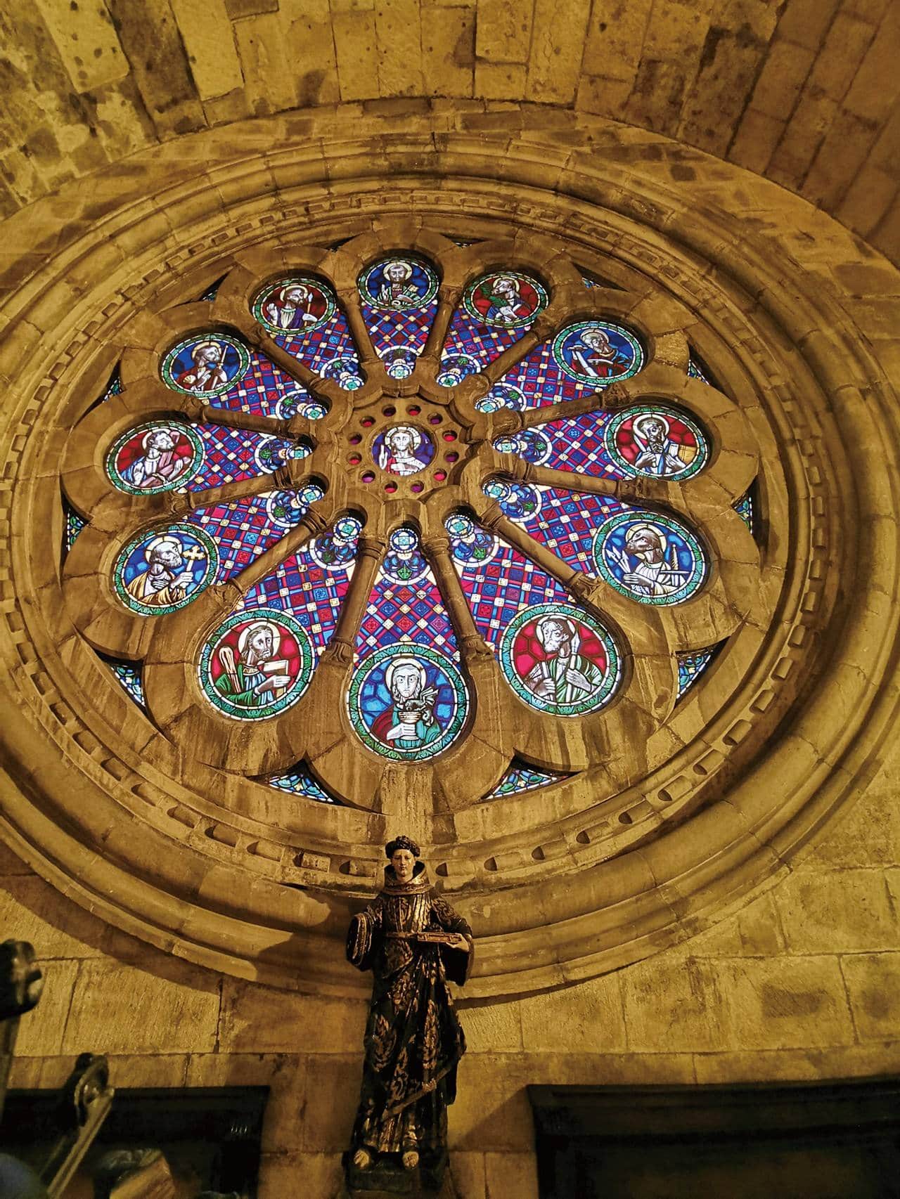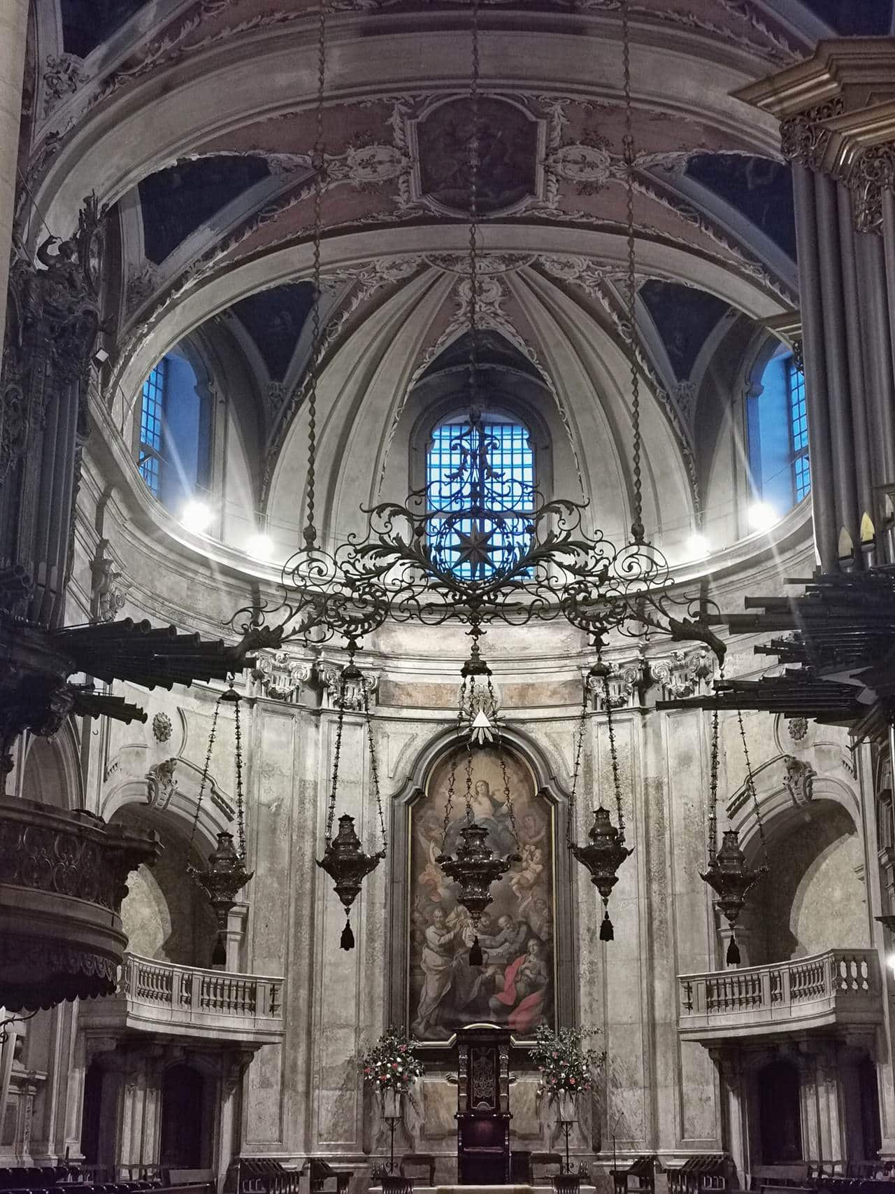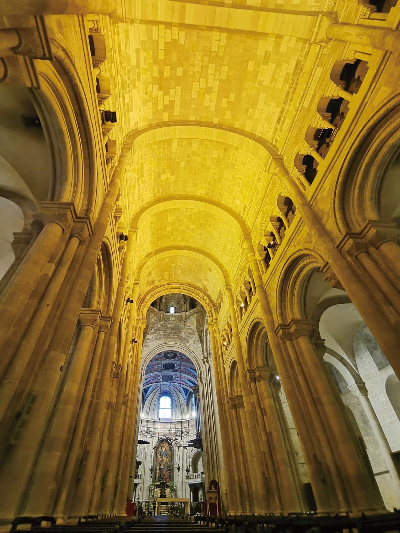 教堂前身是清真寺,葡萄牙國王阿方索一世擊退摩爾人收復里斯本後,為了感恩天主因此興建了主教座堂。大教堂建於12世紀,融合羅馬式、哥德式與巴洛克風格,是里斯本重建與信仰的象徵。1755年的大地震曾摧毀過它,經過修復與擴建,則又讓它多了一層層歷史的表情。走進教堂,內部昏黃的光線讓人立刻沉靜下來,羅馬式拱頂映照著石柱的莊嚴,祭壇後方的玫瑰窗透出一圈柔光,彷彿與時間並肩而行。