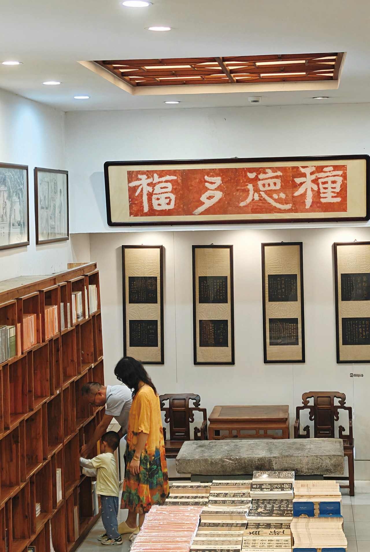 書店共分三層,頗具規模。一樓如江南文人的會客廳,中央長桌鋪陳《石門頌》、《多寶塔碑》等碑帖長卷,兩側書架美術典籍列陣而立。作為全國百家美術專營店,此處既有《芥子園畫譜》珍本,又藏吳門畫派研究專著,連一橋之隔的古吳軒亦難掩其輝。二樓別有洞天,甫踏樓梯,松煙墨香已縈繞鼻尖,百十方硯臺靜臥楠木架,湖筆垂懸如林,宣紙堆疊似雪。此層特設拓片體驗區,讀者可親手拓製珍品,裝裱攜歸。三樓為舊籍秘境,民國小說、晚清線裝醫書、50年代連環畫藏於其間,總能在不經意時與之驚喜邂逅,令人流連忘返。