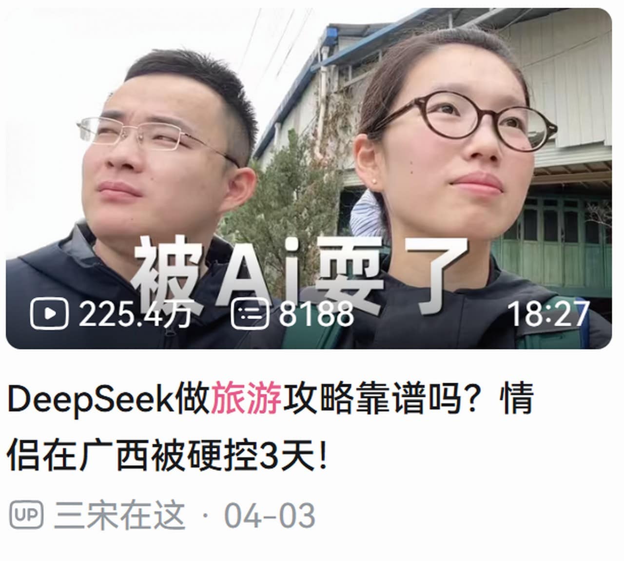 對岸B站(bilibili.com)一對山東年輕情侶,於「三宋在此」頻道發布一支18分鐘的影片〈DeepSeek做旅遊攻略靠譜嗎?情侶在廣西被硬控三天!〉。影片內容是將廣西南寧的旅行規劃交給DeepSeek(中國大陸較常用的生成式AI)並百分百執行,共250萬人圍觀了他們的實測。