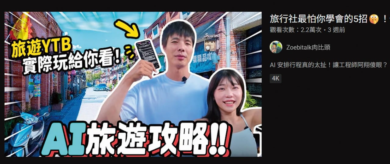 YouTube頻道「肉比頭Zoebitalk」則使用Gemini進行新北三峽一日旅行,展示AI在旅遊規劃、即時導覽和應對突發狀況的能力。