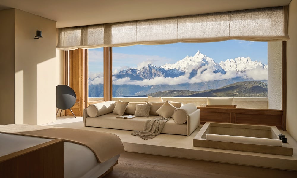 酒店由中國知名建築師莊子玉與吳濱聯手操刀,去年底甫開幕便備受熱議。空間以橫向延展的型態呼應山脈走向,選用純淨的色彩與質地融入藏地文化,消解對原始景觀的侵擾。酒店共計卅五間客房,均沿走廊單向設置,讓住客在房內即可眺望雪山。入住一宿,彷彿與神山對話。
