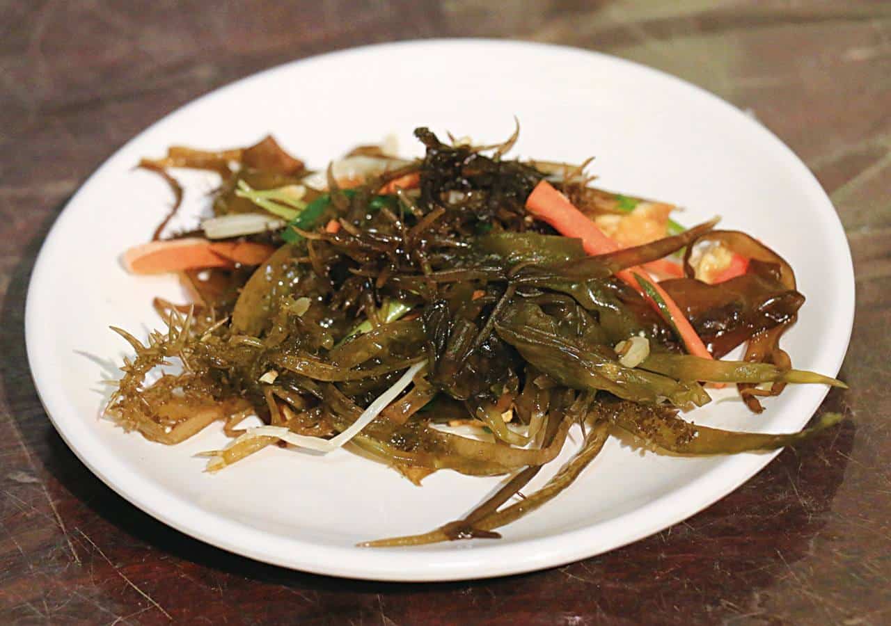 學名為黃氏葉膜藻的海大麵,因狀似百足蜈蚣而又稱蜈蚣藻。生長在水下礁岩,需要浮潛才能採收,口感鮮脆滑嫩,無論涼拌或快炒都十分美味,是東北角特有的海味美食。