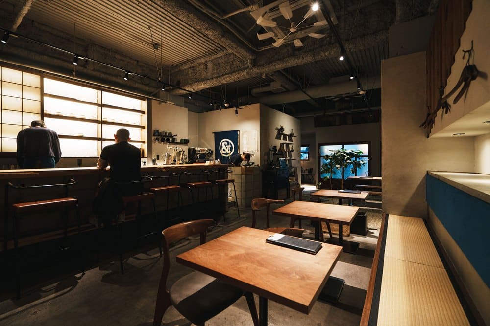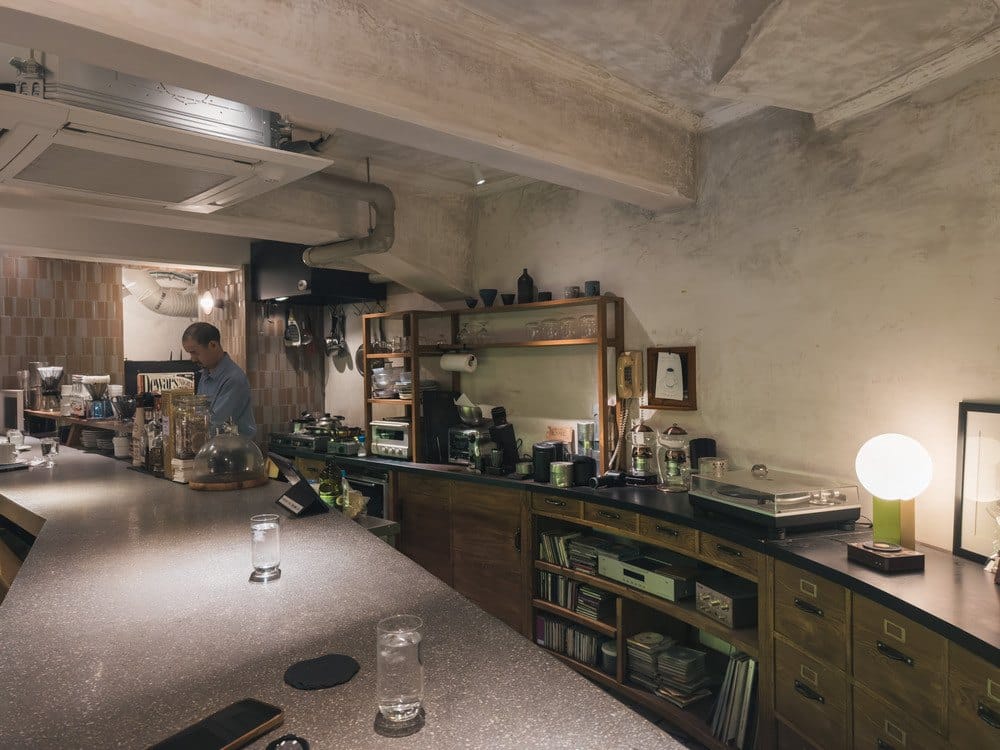 每週7天、每天營業21.5小時的日咖夜酒專門店,幾乎只要醒著的任何時段,就不必擔心沒有提神飲品。裝潢融合現代與和式(拉門、壁龕、燈籠俱全),一列板前座席供人近距離欣賞咖啡師/調酒師的好身手。