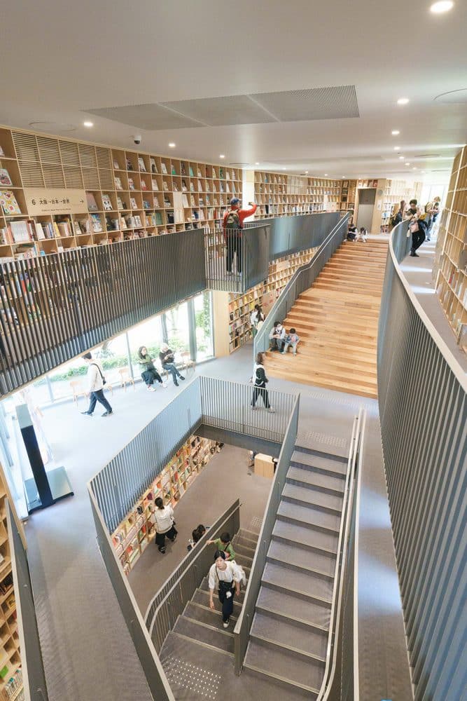 大阪童書之森位於中之島的前緣,建築本體乃至館內桌椅,在在設計成中之島的形狀──一顆平躺的蕃薯。三層建築特意挖空中央部份作為階梯,使人一眼就能望盡與地面屋頂齊高的書櫃,超過萬本當地市民捐贈的書籍則化作枝葉,宛如參天大樹,這才明白何謂童書之森。圖書館內動線蜿蜒,藏有不少私密角落吸引孩子探索;然而格局通透,不至於讓家長疲於奔命。最棒的是,藏書能夠「外帶」到公園閱讀,襯著陽光、河岸、草坪與新鮮空氣,那著實是一座童書之森了!