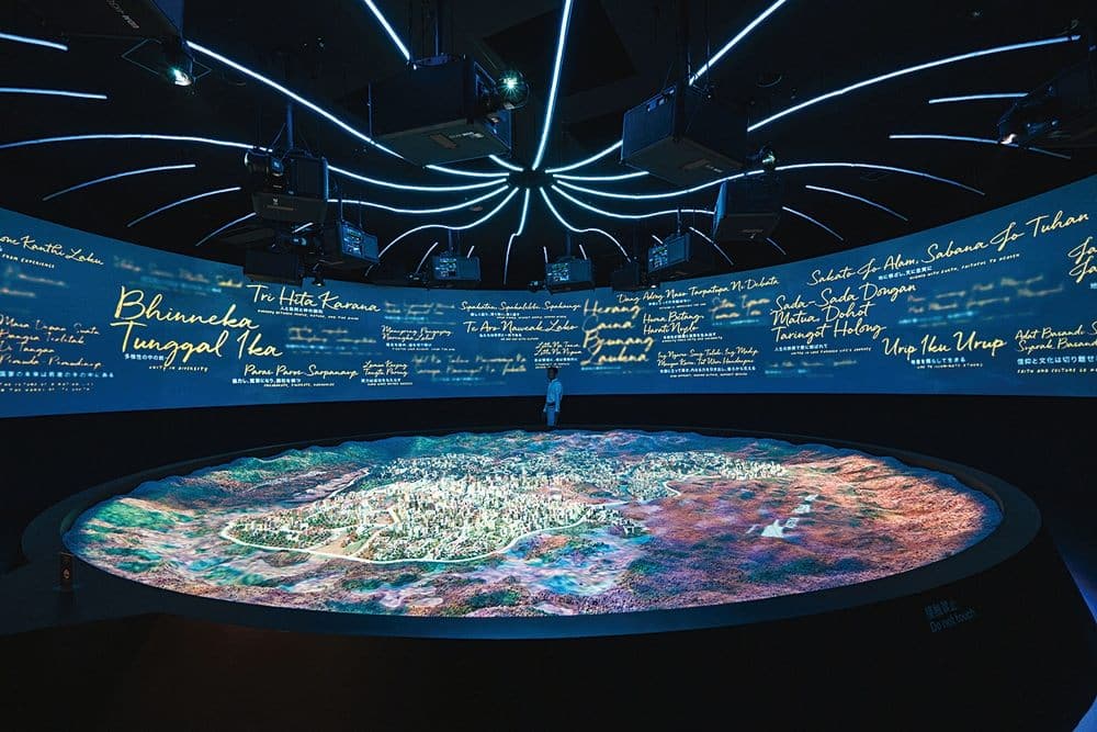 集結自然區、未來區與文化區,傳達人與環境、人與科技、人與傳統,乃至人與神明之間和諧共存的狀態。印尼館建築利用回收塑膠與回收穀物再生而成的「偽木材」建造,場內場外彼此呼應。