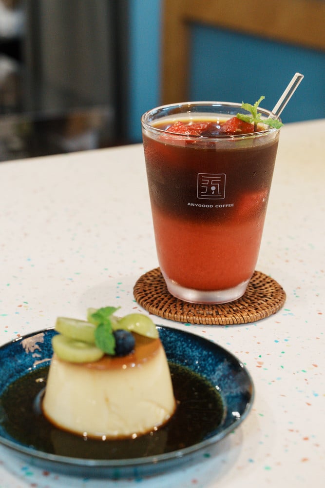 安安親自製作,用大同電鍋做的布丁。焦糖布丁點綴上綠葡萄和藍莓,是這裡最受歡迎的甜點。