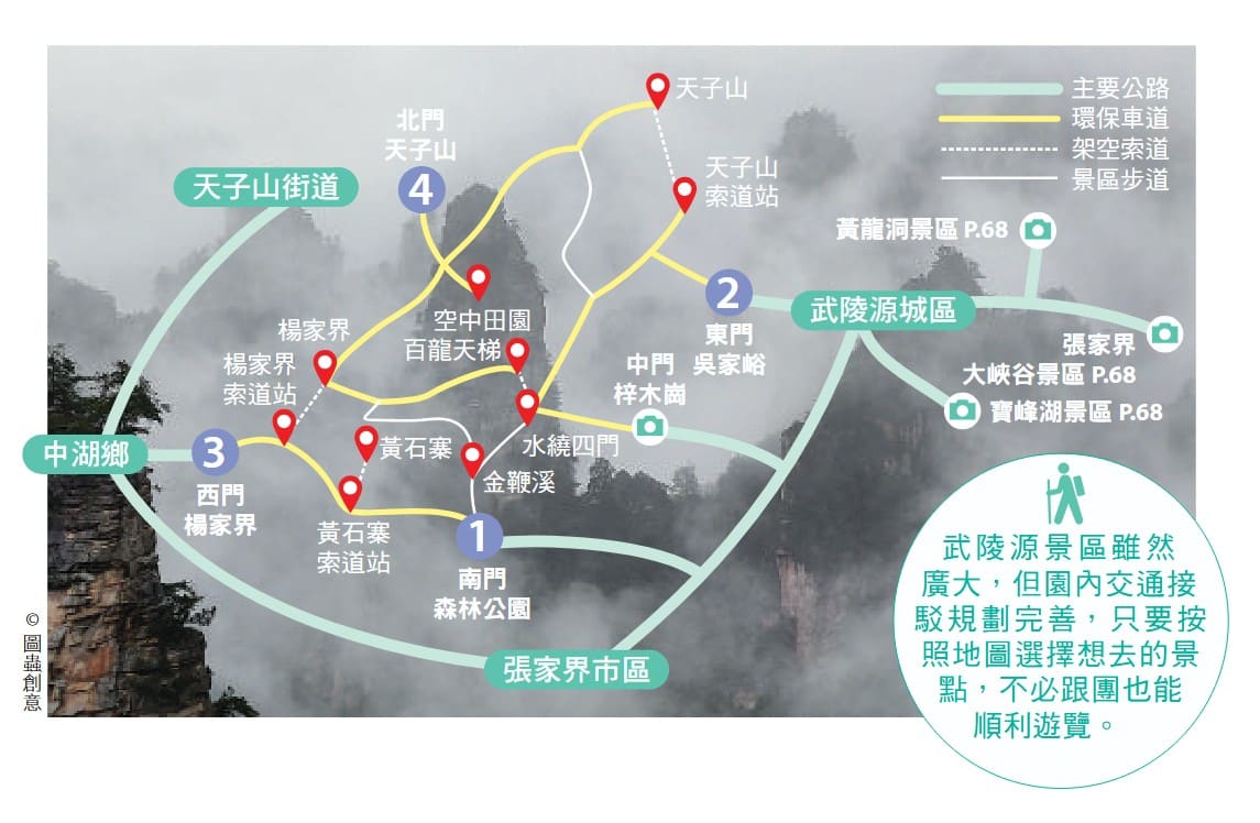 如今,從武陵源景區地圖仍可依稀辨認四天王各自領地。但在景區環保車穿梭接駁之下,各區已無明顯界限,加上滿眼石峰林立,遊人早已欲「辨」忘言。還記得在袁家界取景時,曾聽見遊客抱怨:「怎麼轉來轉去,都是看這些石頭!」的確,來張家界最重要的任務就是看石頭。但要能看山是山、看石頭是石頭,其實一點也不容易。