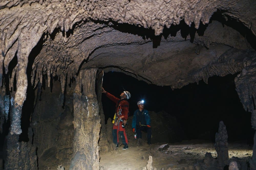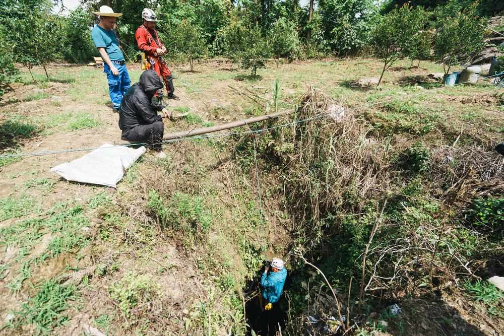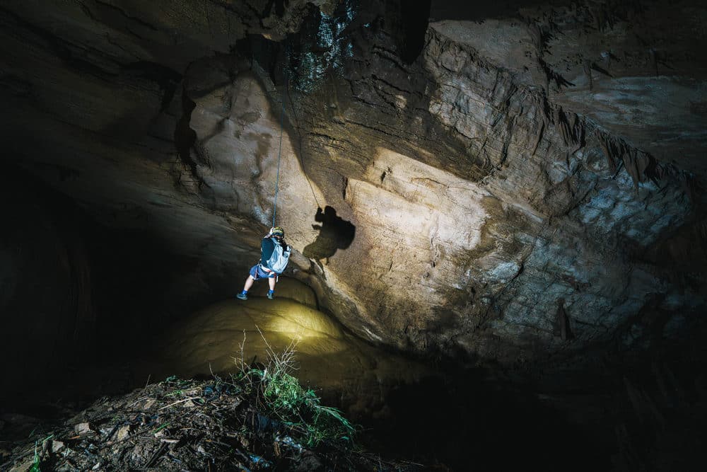 我正吊在半空中,腳下是一個深不見底的黑洞。繩索在身體重量下緊繃,頭燈的光柱掃過洞壁,只照亮一小塊潮濕的岩石,水滴聲在幽暗中迴盪。下一秒,我緩緩被放進30米深的天坑。