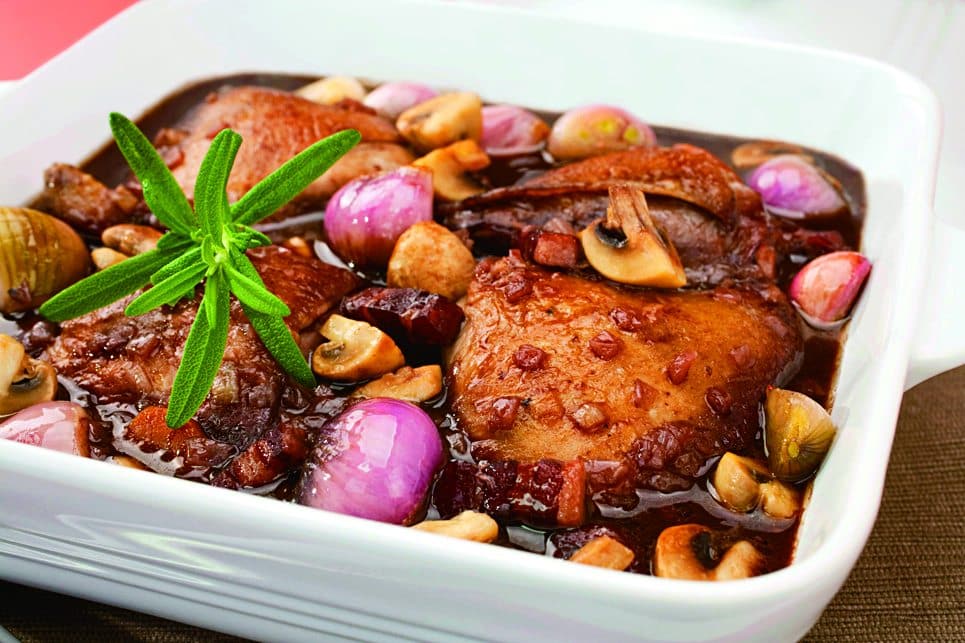 除了紅酒燉牛肉,法國另有一道紅酒燉雞(Coq au vin),菜品據說與羅馬共和國著名的尤利烏斯‧凱撒有關。製作方式為將雞肉油煎後,再以紅酒(通常是勃根地紅酒)燉煮,並以香料調味。