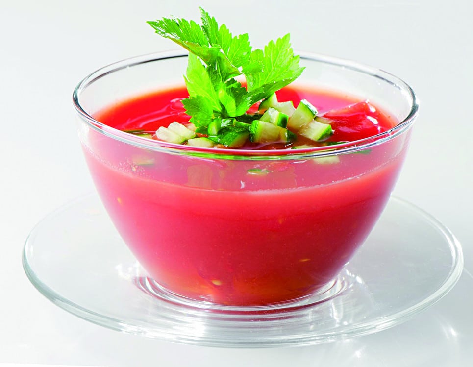 源於西班牙南部安達盧西亞的Gazpacho,是獨屬夏季的涼菜。最初僅是隔夜麵包、鹽、橄欖油、大蒜和醋等混合物,因呈液態狀而稱「湯」。在哥倫布抵達美洲後,又加入了番茄和辣椒。
