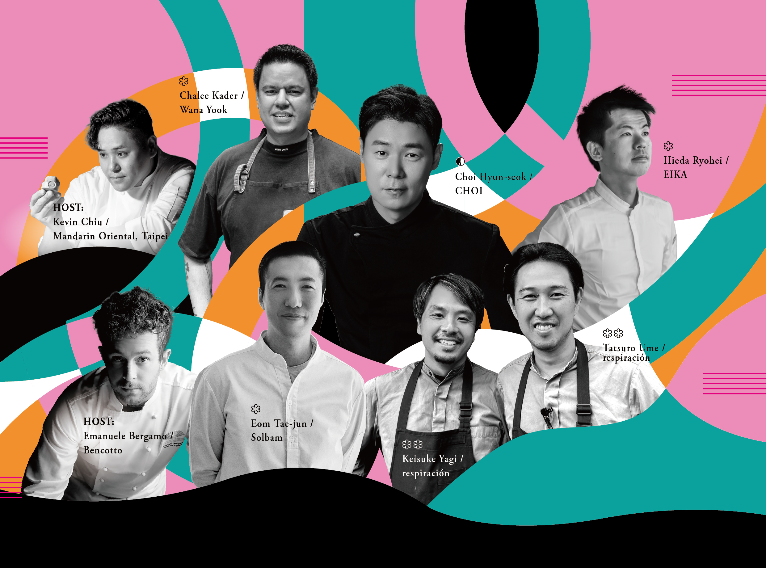 為今年亞洲頂尖美饌交流盛會揭開序幕的「十六手聯烹七道式極致餐酒晚宴」,邀集六位極具指標性地位的名廚齊聚台北,聯手打造一場橫跨地域與文化的美食饗宴,重量級夢幻國際主廚陣容包括:來自日本金澤米其林二星餐廳「respiración」的雙主廚梅達郎 (Tatsuro Ume) 與八木恵介 (Keisuke Yagi),「respiración」是現代西班牙料理餐廳,榮獲米其林二星與綠星的雙肯定,成為金澤最具代表性的餐廳之一;首爾米其林一星餐廳「Solbam」主廚嚴泰俊 (Eom Tae-jun),「Solbam」以當代手法重構韓國傳統風味,透過當季在地食材講述回歸土地的料理敘事,開業僅一年便榮獲米其林一星,成為新世代韓國料理的耀眼代表;曼谷米其林一星餐廳「Wana Yook」主廚查理・卡德 (Chalee Kader),「Wana Yook」以當代視角演繹泰國傳統料理,融合創新手法與「nose-to-tail」理念,體現對食材與環境的尊重;首爾超人氣餐廳「CHOI.」主廚、同時亦為韓國知名「黑白大廚:料理階級大戰」的明星主廚崔鉉碩 (Choi Hyun-seok) ,憑藉前衛創意料理風格與鮮明個人魅力,躍升為韓國餐飲界指標人物,其餐廳穩居首爾最難訂之列,深受饕客追捧;台灣米其林一星餐廳「盈科 EIKA」主廚稗田良平 (Hieda Ryohei) ,「盈科 EIKA」以「尋常中見不凡」對食材的極致理解尊重,締造了台北當代日料的新高度;外加酒店米其林指南入選義大利餐廳「Bencotto」主廚艾曼紐・貝爾加莫 (Emanuele Bergamo) 與行政西點主廚趙崇曦 (Kevin Chiu) 聯手獻藝。