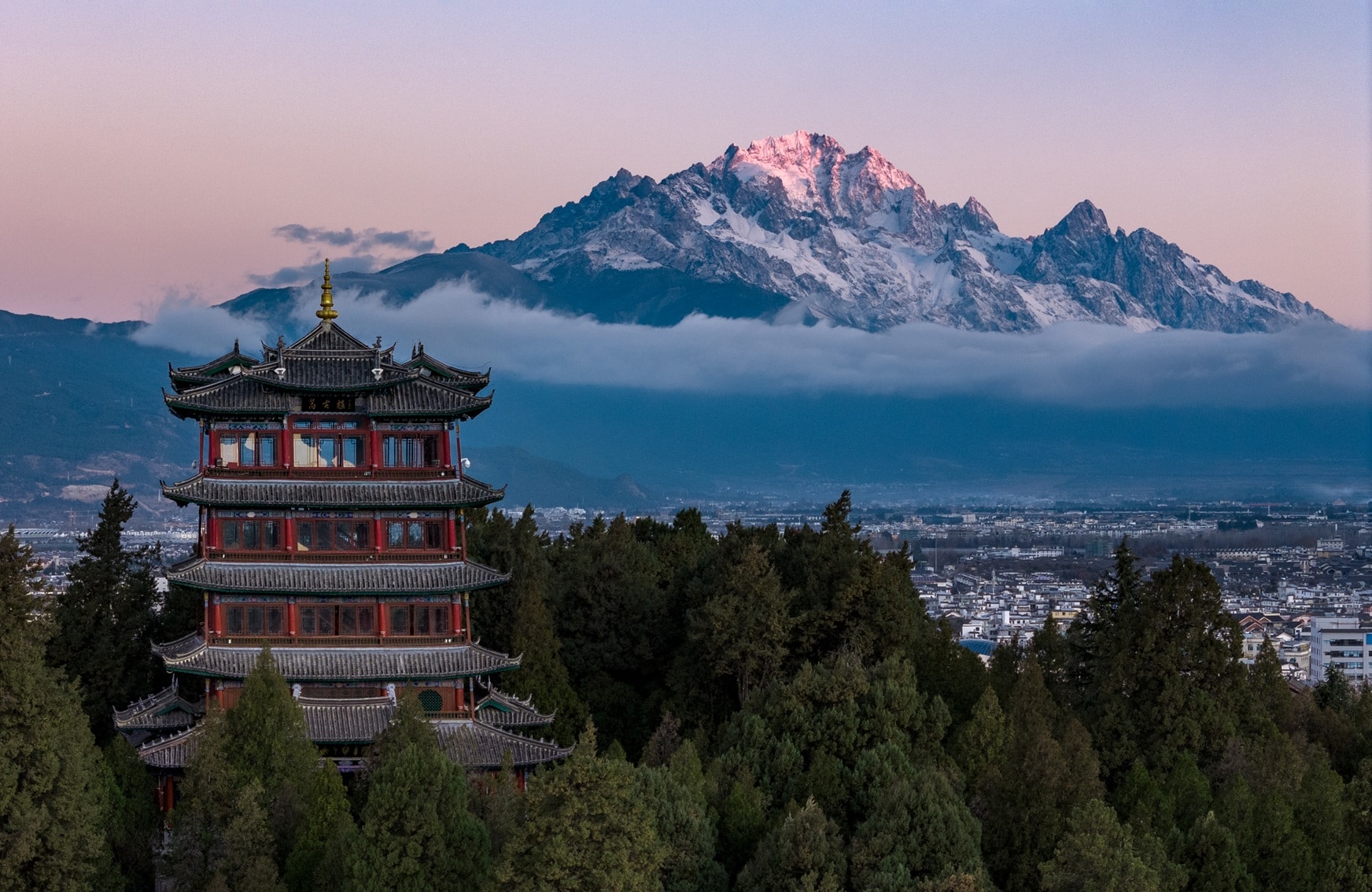 位於江古城西側獅子山頂的萬古樓,是麗江必去的景點之一。
