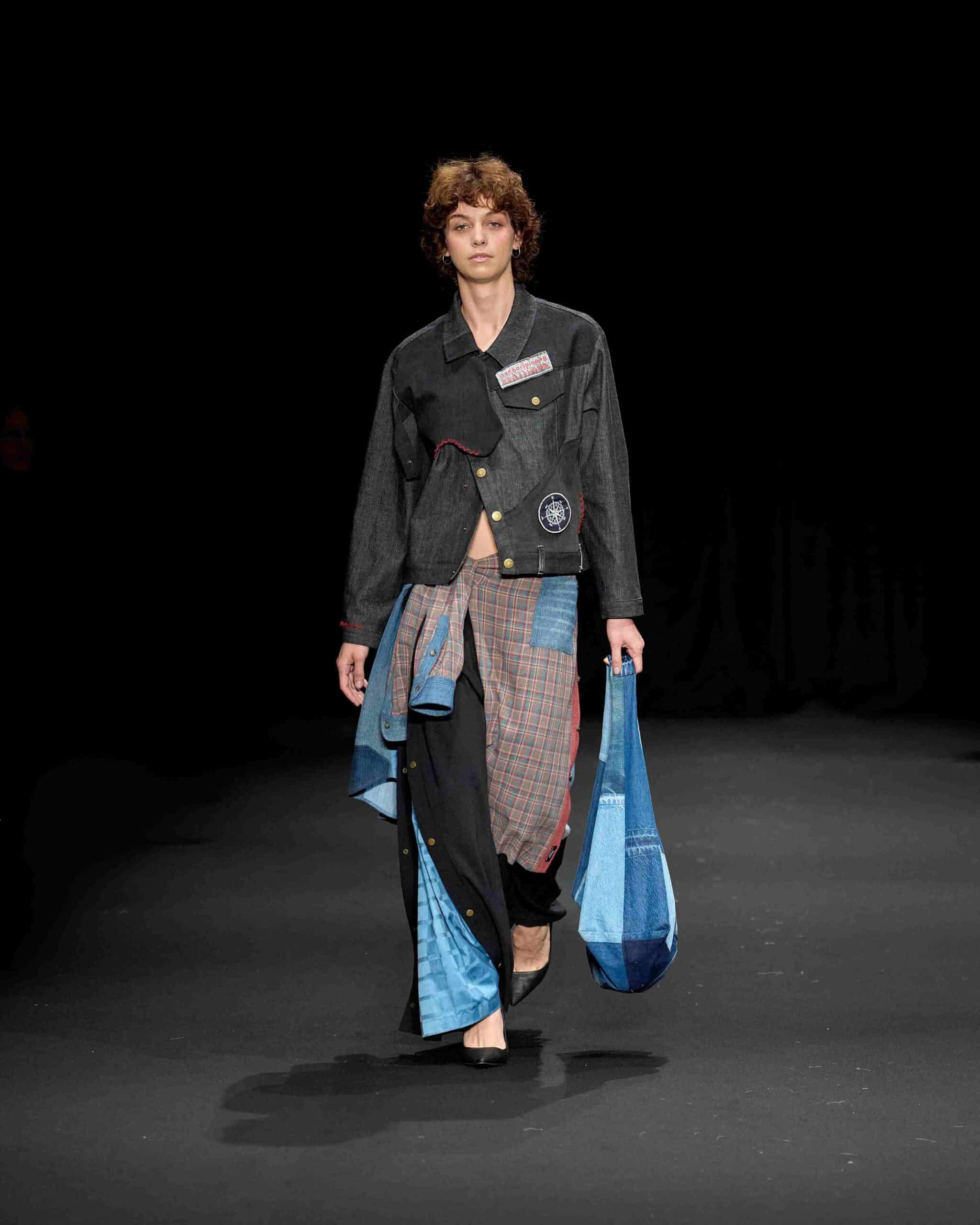 東京時裝周Story Wear 2026 SS 系列 Look 9,設計團隊將黑狗廓形結合回收黑色牛仔褲製成。