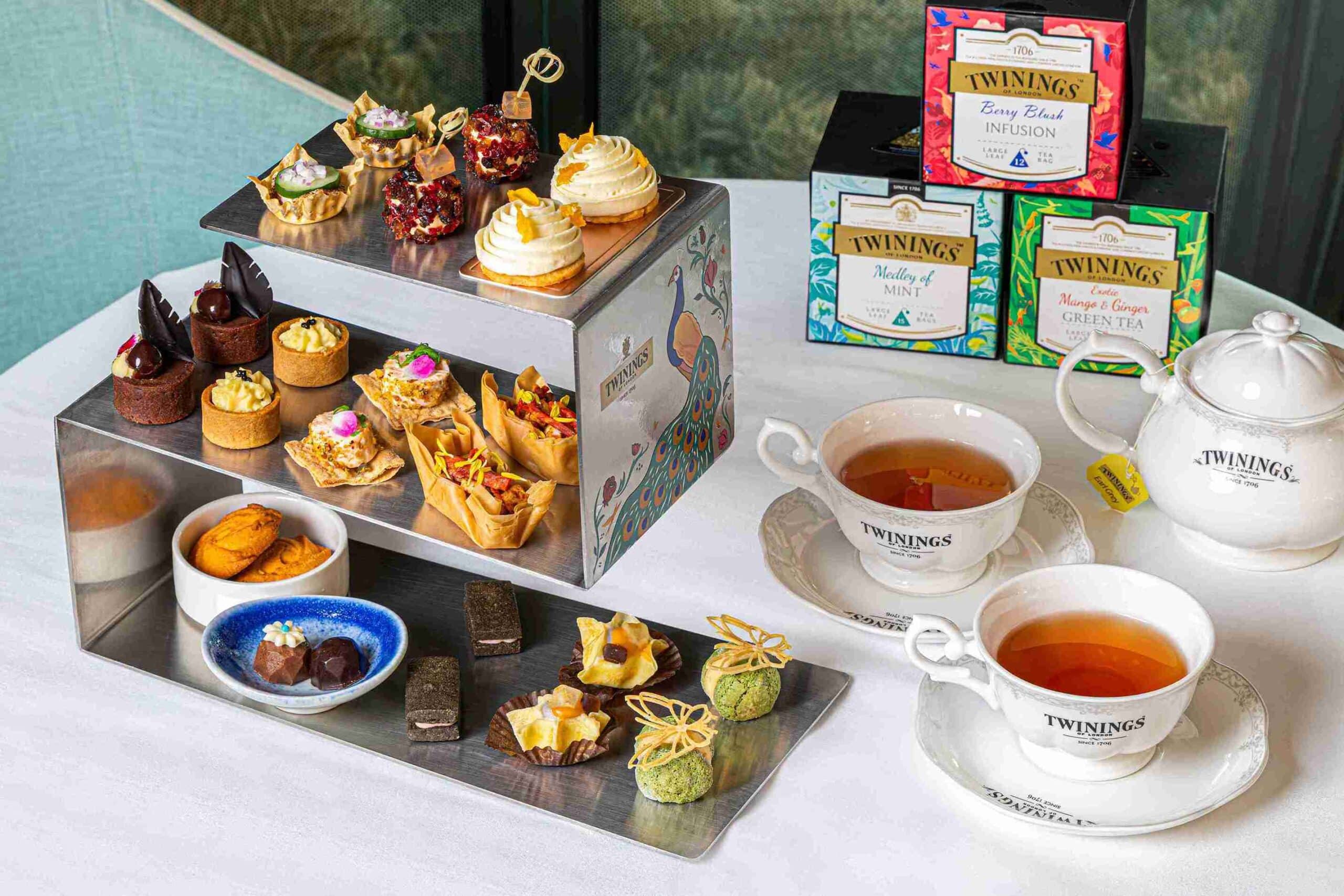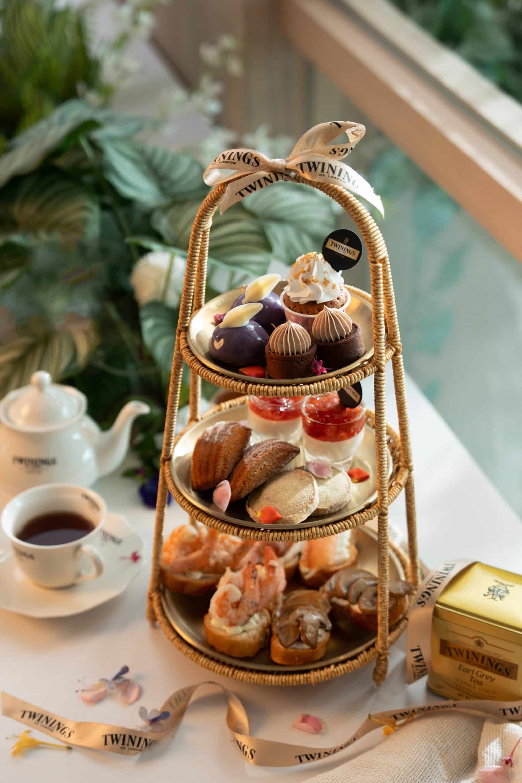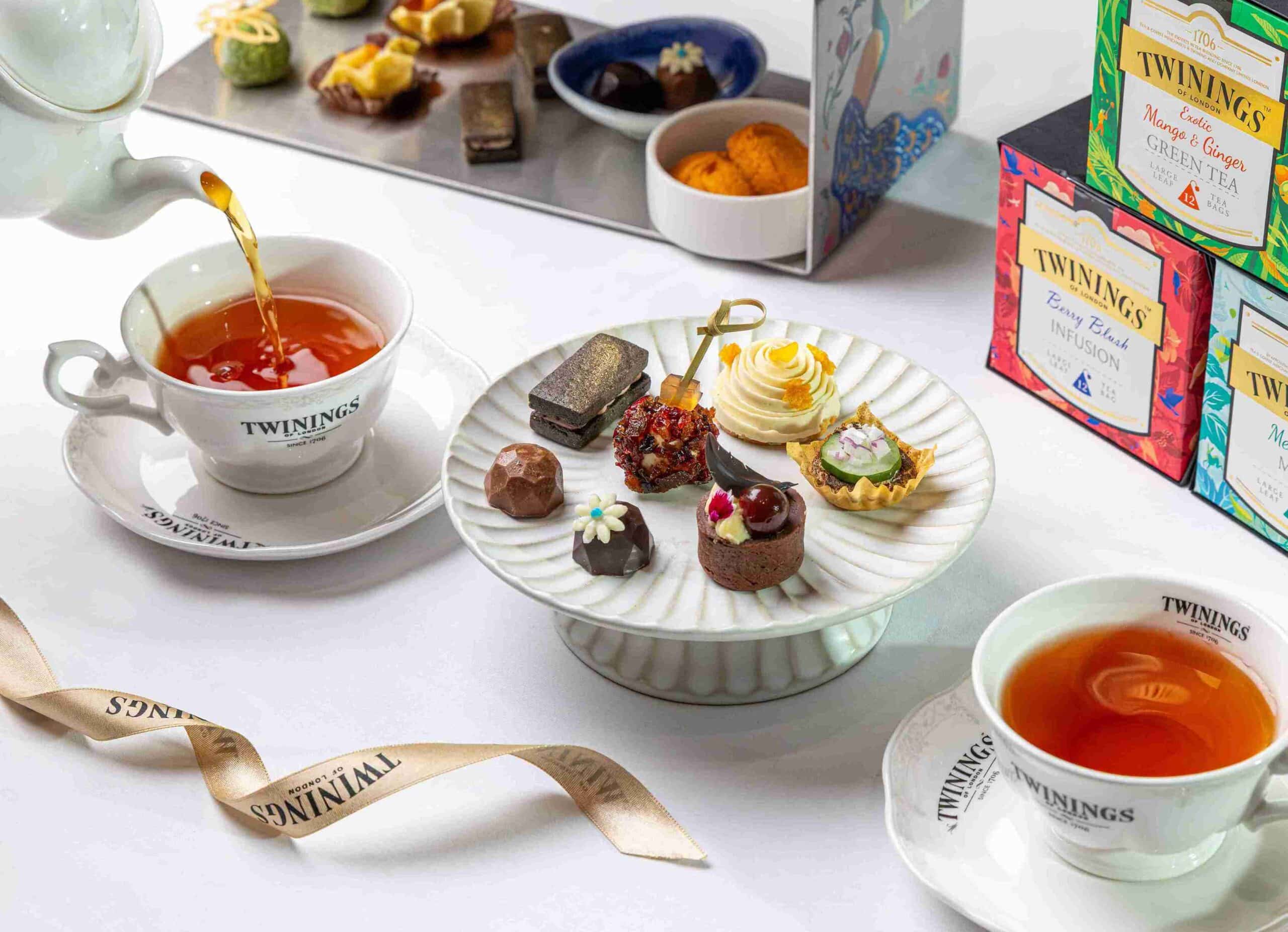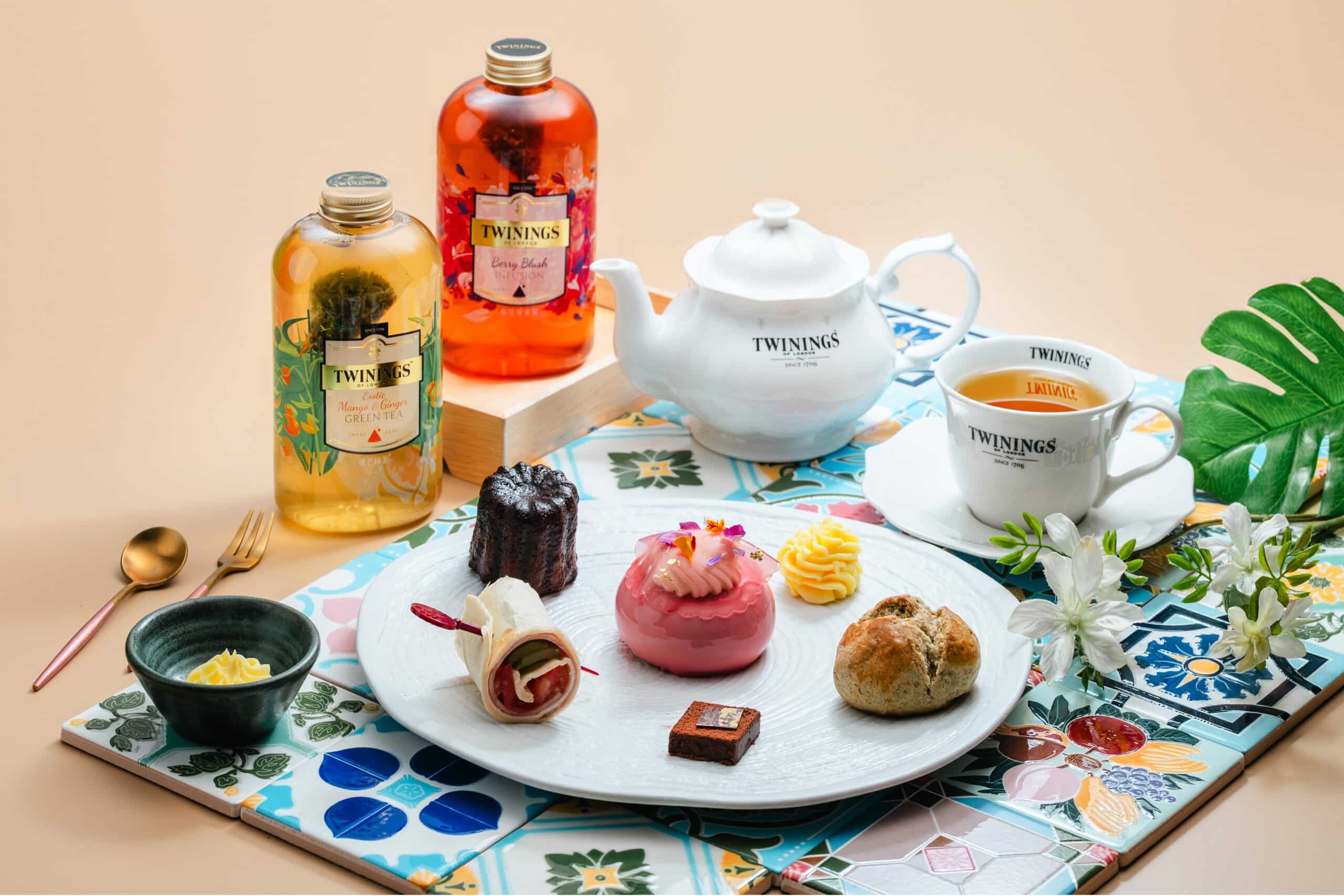 鹹點部分,以歐式大吉嶺茶製作的「茶香鮪魚脆餅」清爽迷人,優雅茶香於齒間綻放;甜點則包含以皇家伯爵茶製成的「TWININGS 經典伯爵巧克力」,佛手柑與紅茶香氣層次豐富;胭脂莓果茶融入「莓果起司球佐莓果茶凍」與「黑金 TWININGS 胭脂莓果夾心酥」,酸甜交織出濃郁韻味;「TWININGS 薄荷圓舞曲巧克力塔」以清新茶香平衡巧克力的濃厚;而「TWININGS 薑芒綠茶慕斯米香塔」則將茶葉研磨成粉,揉入芒果慕斯中,結合薑香與綠茶爽感,堆疊出豐富口感。