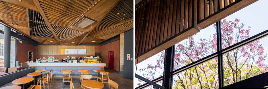 門市外觀以「森林中的玻璃盒」為設計概念,整體採大地色系與開放式天花設計,搭配簡約背景與線性木質框架,透過玻璃引入漫射自然光,與幾何線條交錯產生 「動與靜」的光影對比,彷彿置身於森林中觀賞著樹冠的光影變化,增加視覺趣味及空間律動感,讓顧客在品味咖啡之餘,也能沉浸於春日賞櫻的悠然時光。
