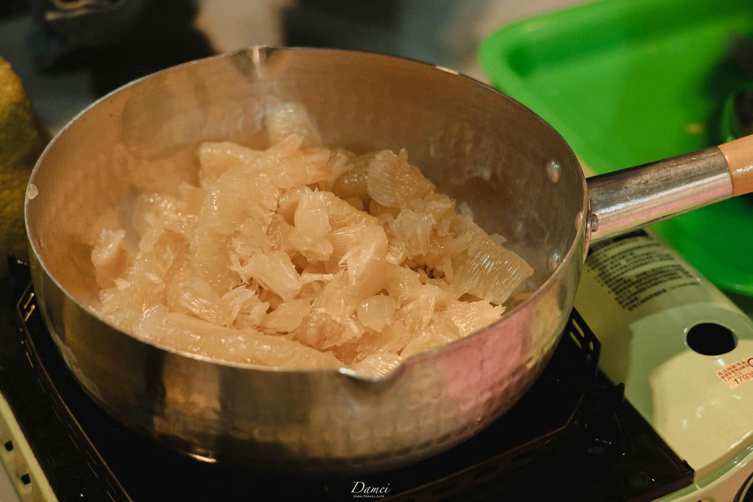 從文旦園離開後,我們回到驛站準備親手製作文旦果醬,親手將一顆顆文旦肉撥下放至鍋內,必須說這工序特別麻煩,不過我在隊員認真撥文旦的時候偷吃了一兩口,真的滿甜的又軟嫩。