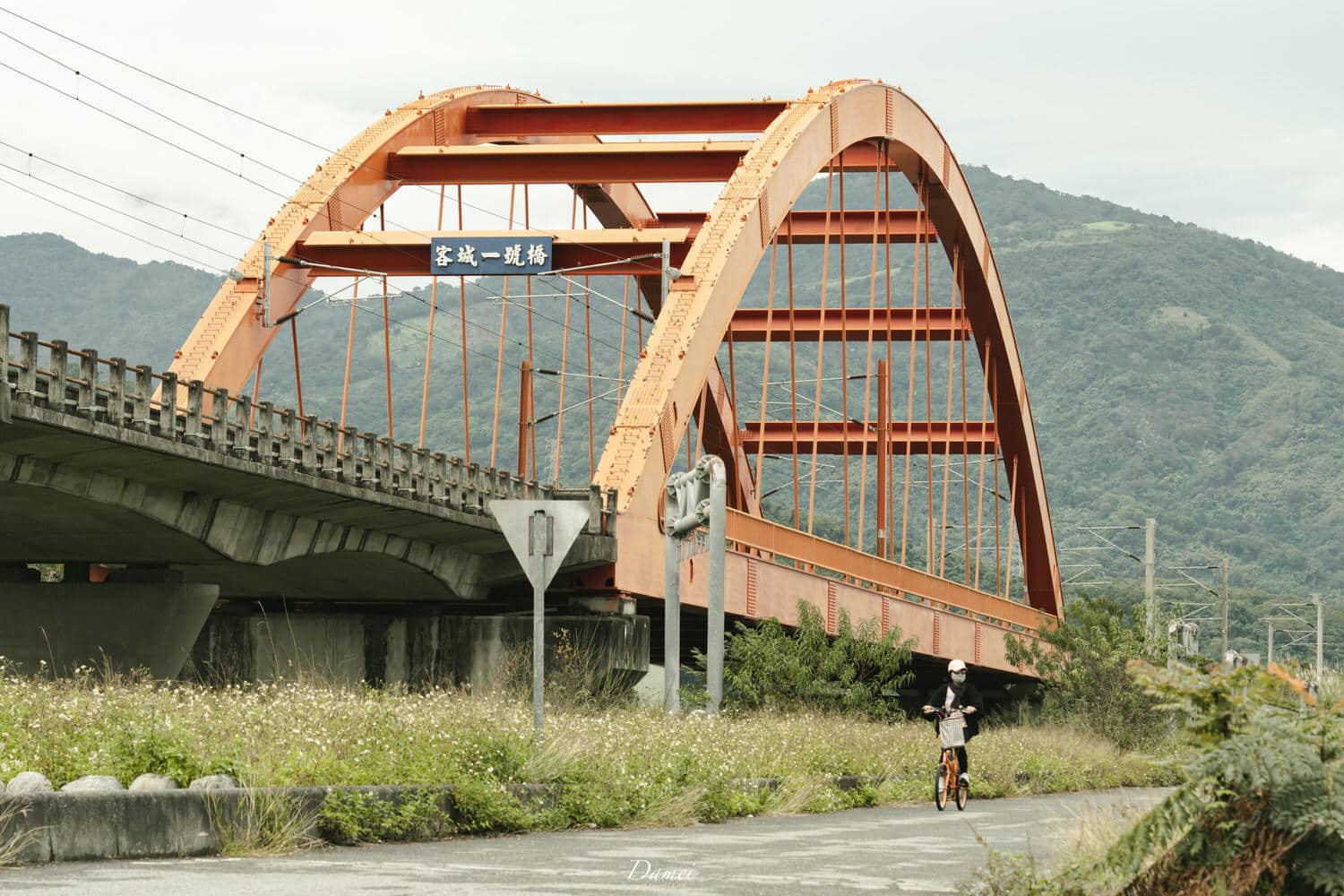 兩座紅色拱橋顯得特別耀目,客城鐵橋或許是遊客來玉里必訪的行程之一了,可惜我們到訪的時間錯過火車經過的時間,即便單純拍攝拱橋也是很有氛圍呀,謝謝騎乘單車的阿姨讓我有一個美美的畫面!