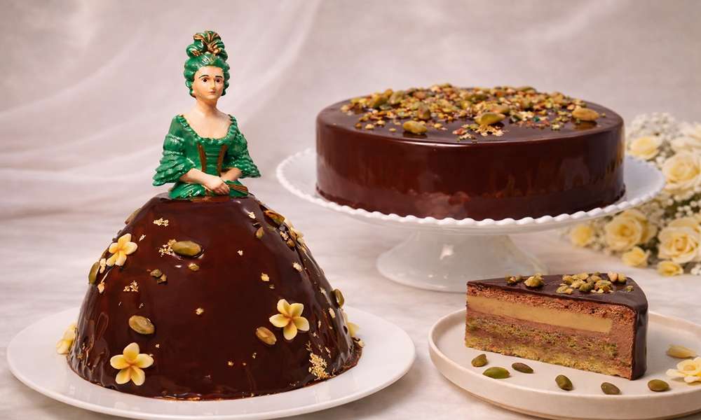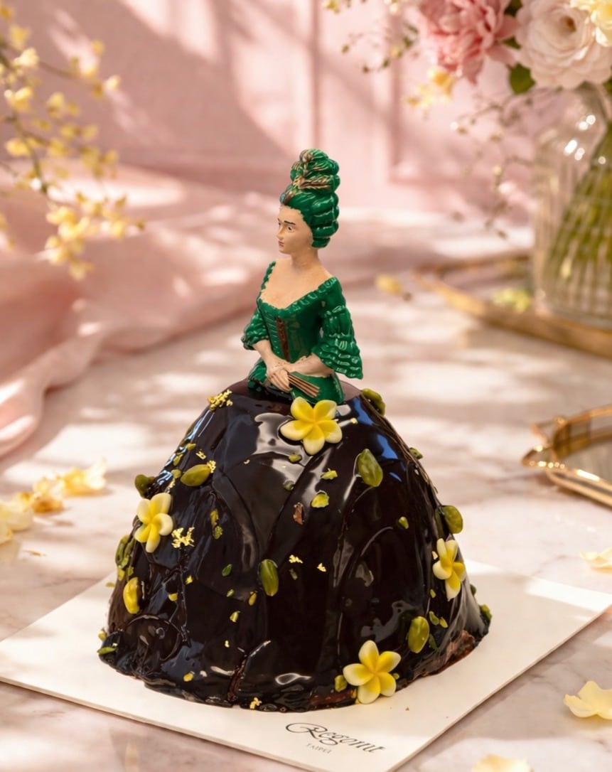 年年華麗登場的晶華經典代表作「3D立體Marquise侯爵夫人蛋糕」今年跟風展現杜拜巧克力風華。主廚延續以法國路易王朝第一美女龐畢度侯爵夫人(Marquise de Pompadour)為靈感的優雅造型,將蛋糕長、寬17公分、高23公分的立體結構轉化為宛如高訂禮服般的視覺焦點。展開的裙襬是以開心果海綿蛋糕為基底,結合滋味濃郁的杜拜巧克力內餡以及質地滑順的開心果奶油慕斯,層層堆疊出豐富口感,外層則包覆光澤細緻的巧克力淋面並點綴開心果碎與巧克力花卉,呈現外層香滑、內層綿密且帶有酥脆餡心的多重風味。最後搭配自法國空運來台的侯爵夫人人偶,整體宛如一件可品嚐的藝術作品,兼具視覺張力與味覺深度,每個售價2,980元。