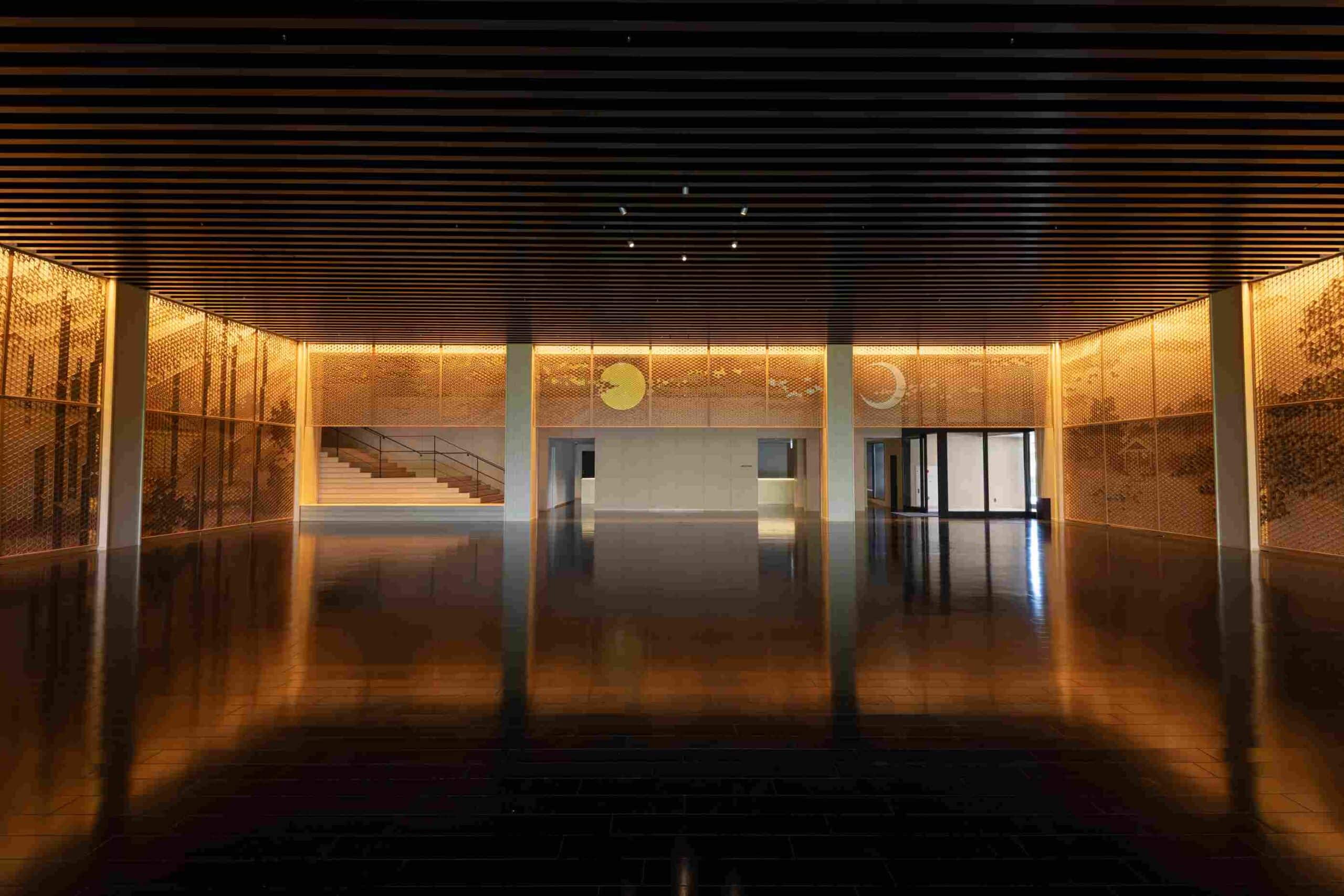 主大廳。作為「日本美學意識之縮影」,以及傳統技藝與自然景觀和諧共鳴的場域。最具代表性的,莫過於三面牆上高約4公尺的組子細工藝術作品「光風庭傳(こうふうていでん)」。由水墨(墨繪Sumie)畫家小林東雲與組子職人木下正人兩位大師聯手,將八芳園中的月影與松濤,以水墨意境與木作工藝交織重現。這件歷時一年多才完成的巨作,完美呼應了日本傳統與現代感性的共生。©八芳園