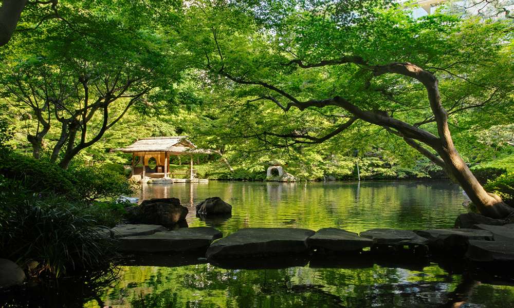 八芳園位於東京都港區白金台,擁有一座自江戶時代初期延續至今、佔地廣闊的日本庭園。園內巧妙配置了回遊式池塘,擁有樹齡數百年的古木與季節花卉,交織日式庭園獨有的典雅逸趣。錦鯉悠游池間、水鳥驚鴻掠影,這幅自然畫卷,也隨季節更迭展現不同風情—春櫻、夏綠、秋楓、冬雪,為到訪者提供遠離日常的靜謐療癒。
