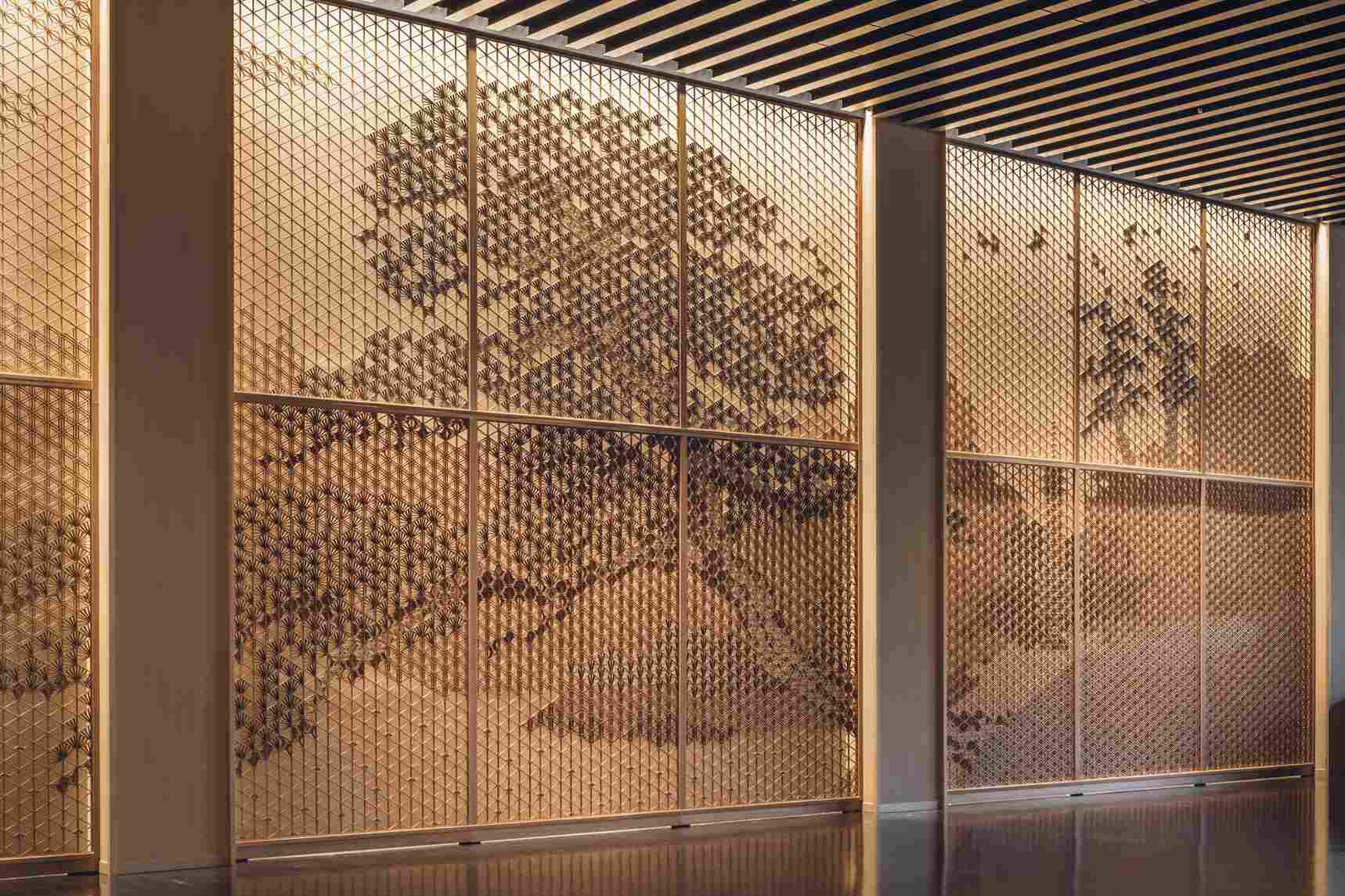 不使用任何釘子,僅憑精密木片嵌合勾勒紋樣的「組子細工」。以大量紋樣的疊合,交織出宛如繪畫般的精美創作。本作品以象徵日本庭園的「赤松」為核心,將光的移轉、風的流動、自然的蒼勁生命力,以及對訪客幸福的祈願,悉數寄託於職人之手。透過組子的細節紋理、金箔與鉑金箔的華美閃耀,疊加水墨畫的躍動感,多種技藝彼此呼應,讓整座空間彷彿化作庭園的延伸,展現極致空間美學。©八芳園